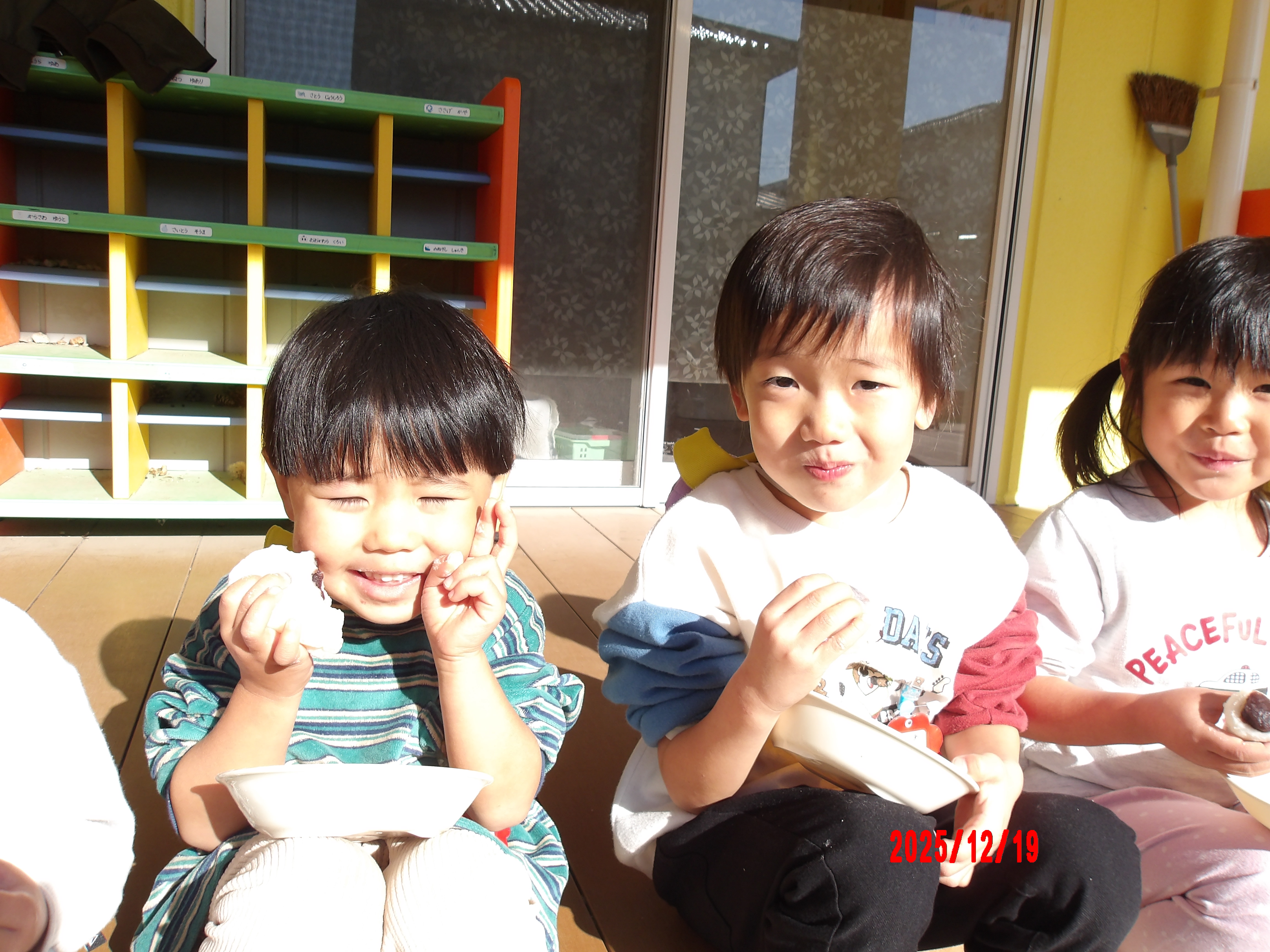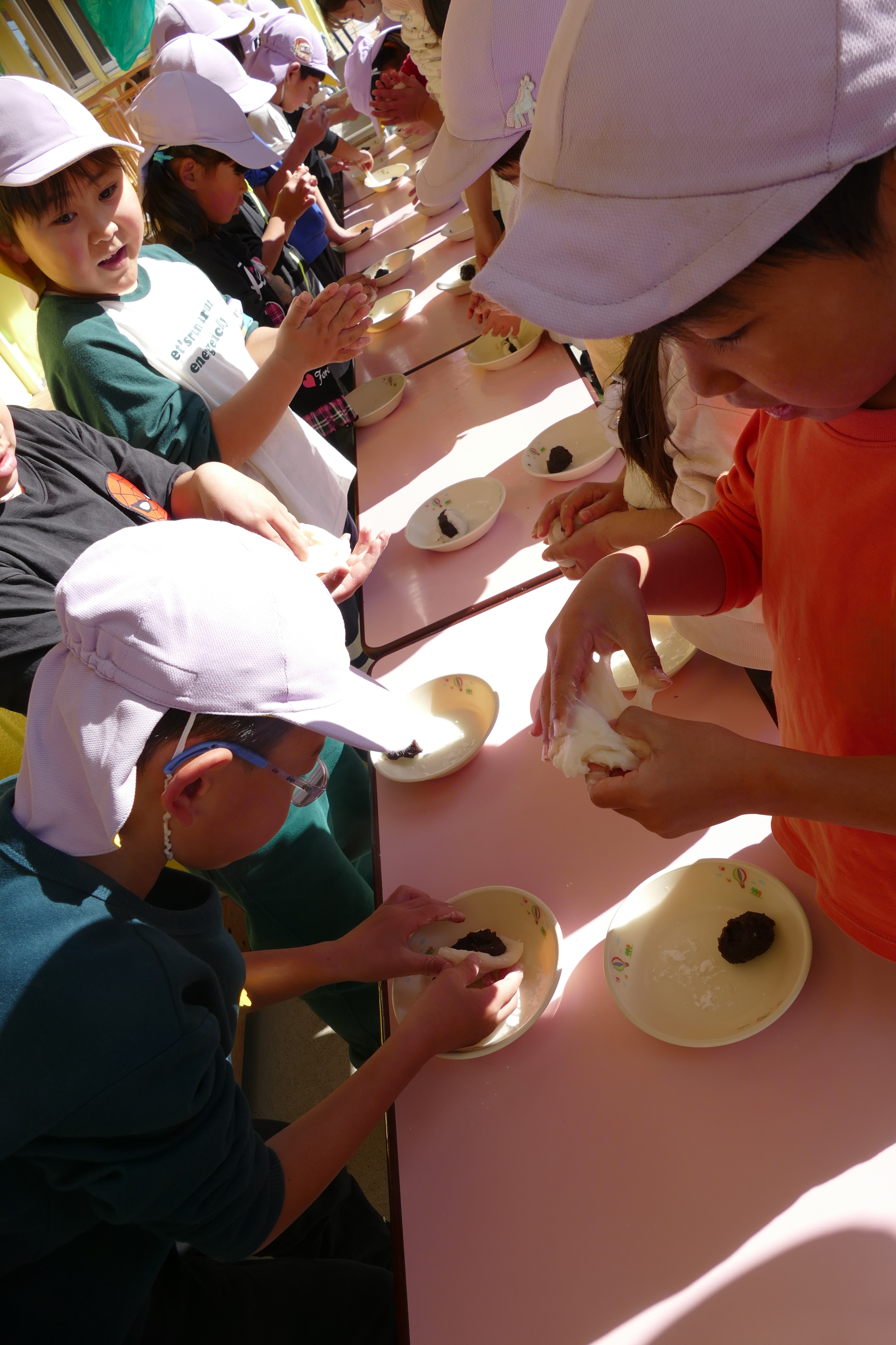 小さいクラス(0~2歳)のお友だちは出来たてのおこわを味見し、大きいクラス(3~5歳)のお友だちは、自分たちで出来立てのお餅にあんこを包んで、丸め餅を作って食べました♪♪ あんこやお餅が苦手なお友だちもいましたが、自分で作ったお餅は美味しかったようでほとんどのお友だちが「おいしかった~!」とご満悦の表情(*´ω`*)♡