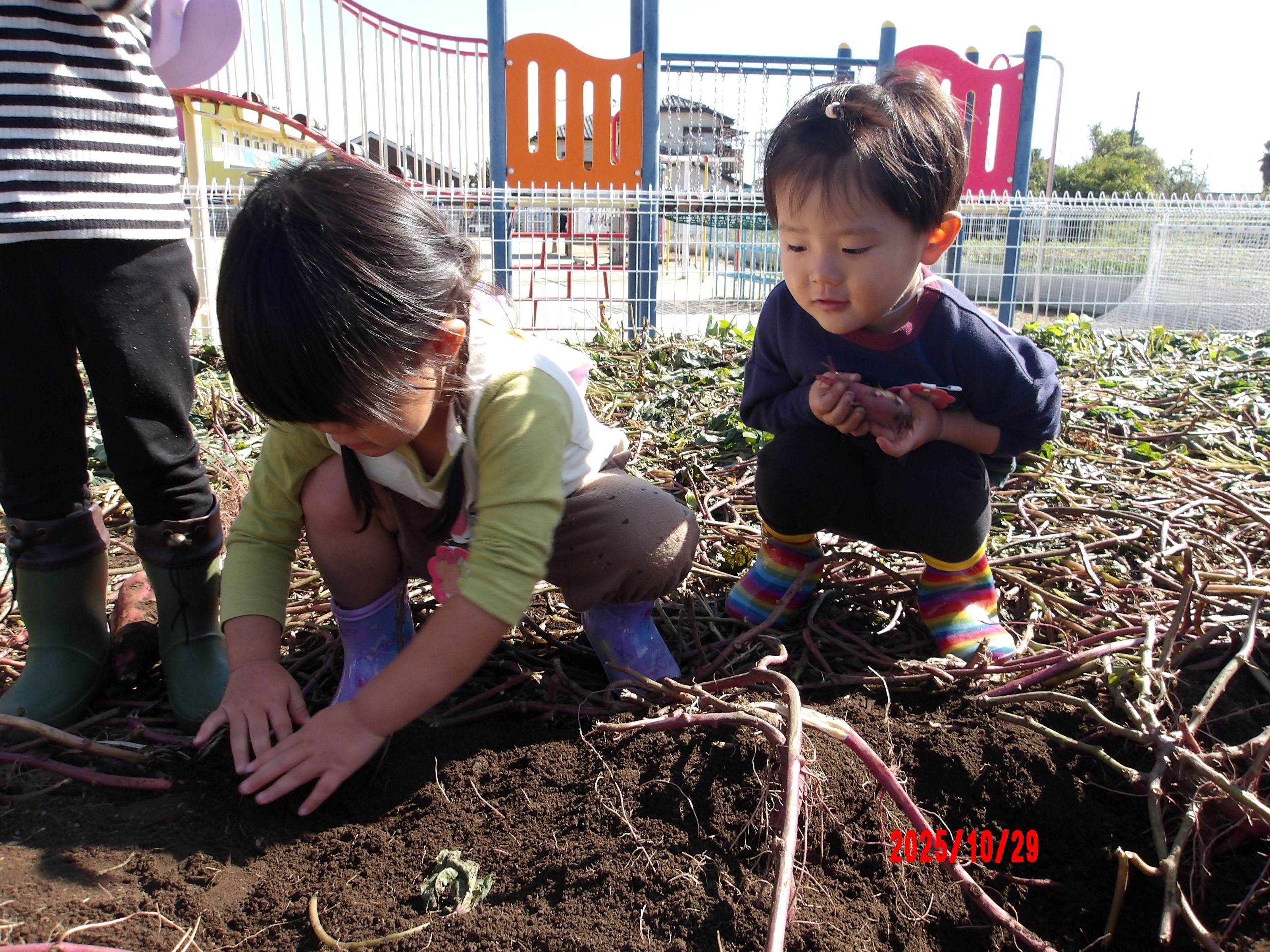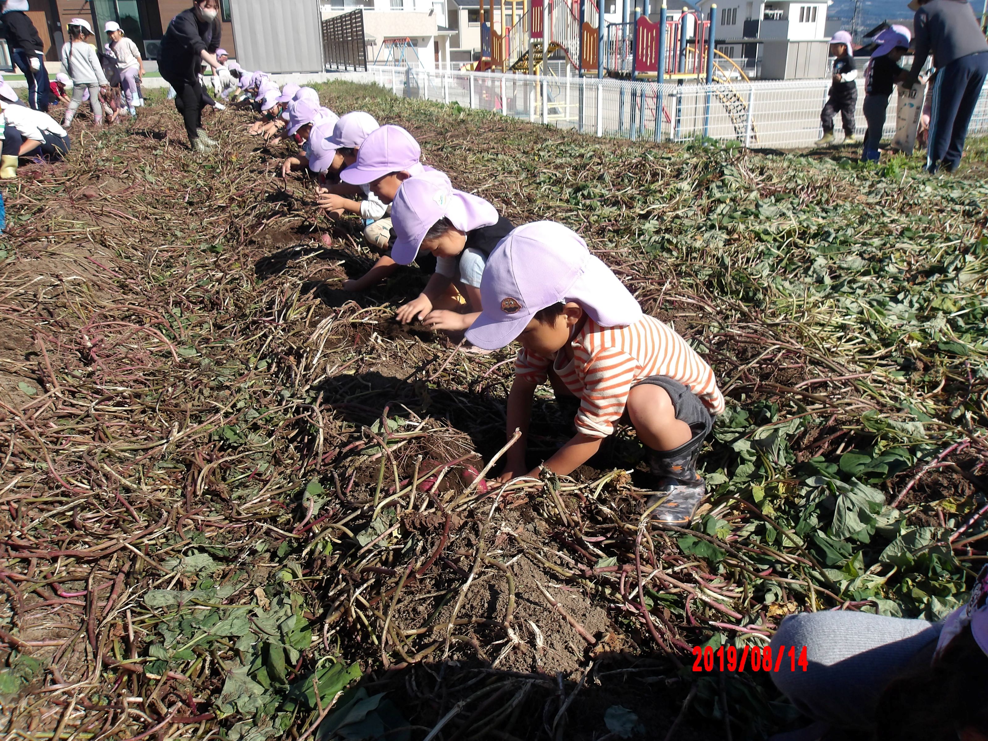 5月にばら組さん・あやめ組さん・きく組さんが苗植えをしてくれたさつまいもがぐんぐん成長して収穫時期になったので、10月下旬にみんなで収穫体験をしました✨
